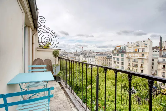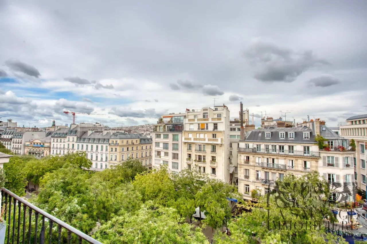 Cet espace, au charme traversant, profite de vues dégagées à la fois sur un square arboré et son église d’un côté et sur les toits emblématiques de Paris de l’autre. Une seconde chambre pourra y être aménagée selon vos besoins.