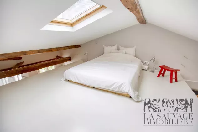 L’appartement comprend également une chambre en mezzanine, une salle de bains et des toilettes séparées.