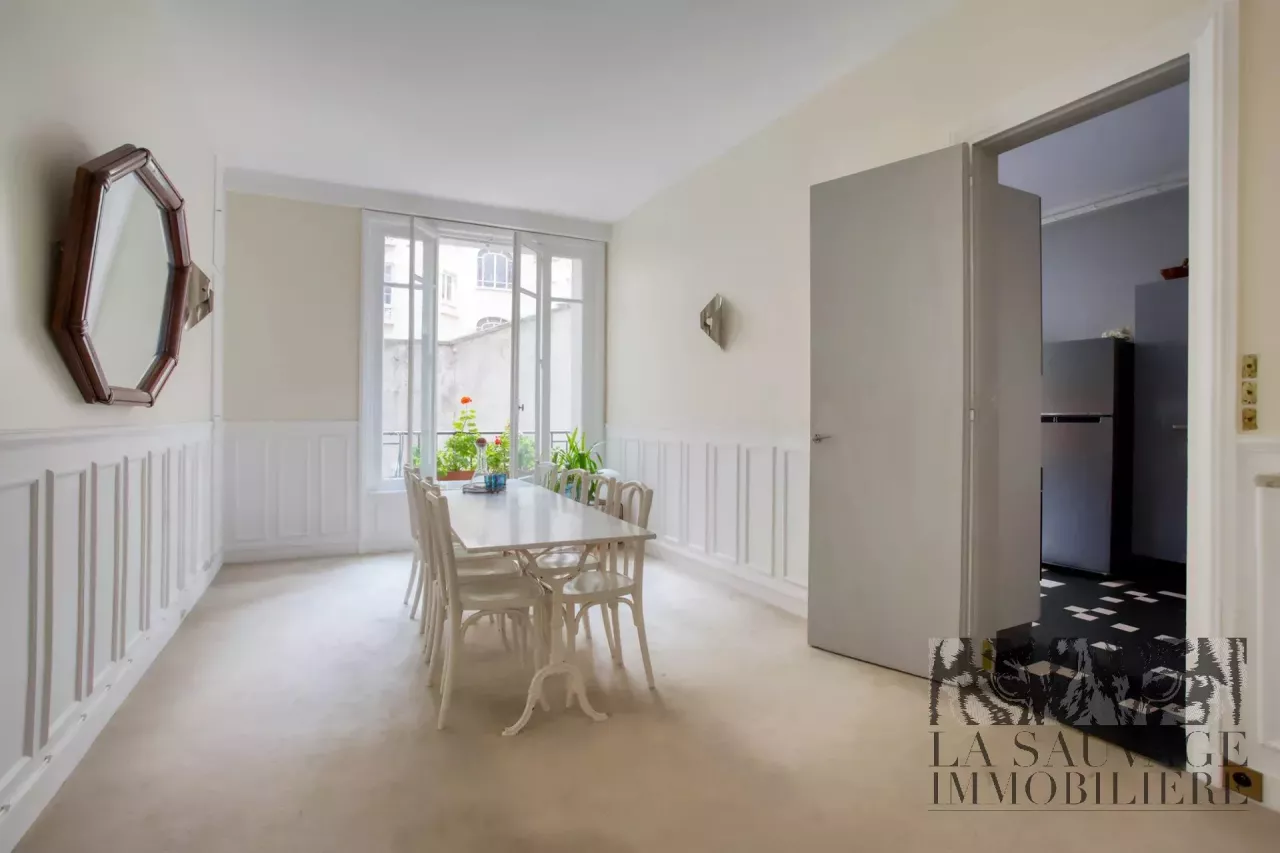 L’entrée spacieuse ouvre sur un salon lumineux avec vue sur rue, suivi d’une salle à manger sur cour, calme et intime, pouvant aisément être transformée en quatrième chambre selon les besoins.