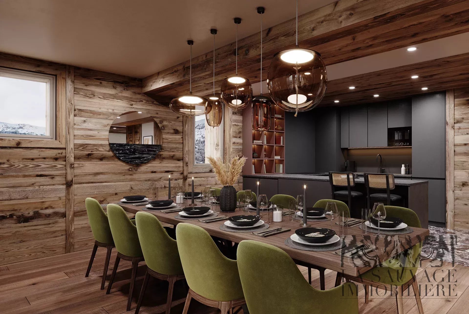 Le vaste séjour avec cuisine ouverte, d’une superficie de plus de 115 m², s’ouvre sur un balcon exposé Ouest, baigné de lumière et idéal pour admirer les couchers de soleil sur les montagnes.