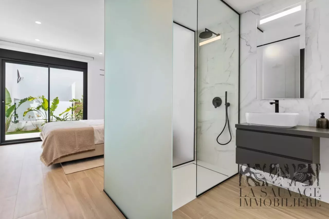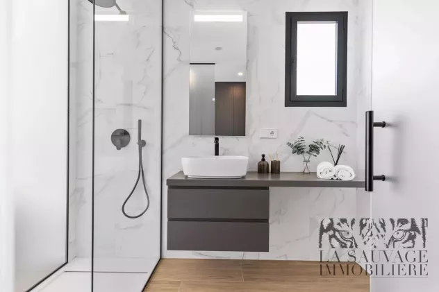À l’étage, l’espace nuit dévoile une atmosphère plus intime. La suite parentale, véritable refuge, dispose de sa salle de bain et s’ouvre sur une terrasse avec vue mer, offrant un cadre apaisant au quotidien. Une seconde suite complète cet étage, garantissant confort et indépendance.