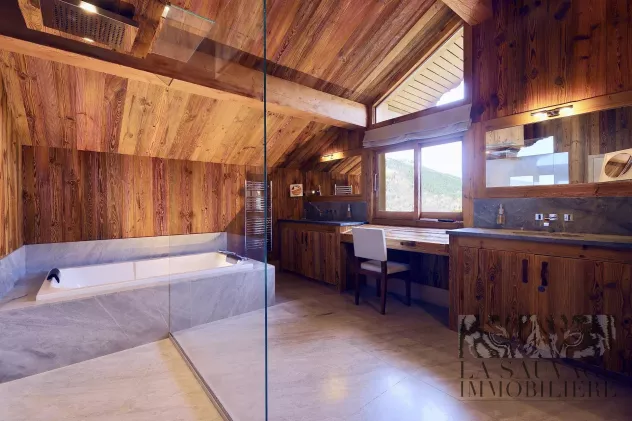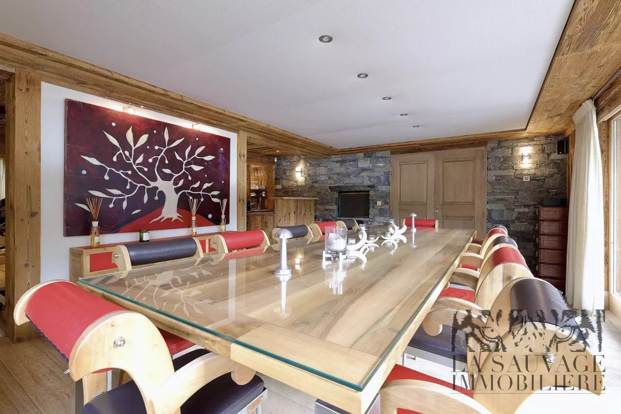 At the heart of the chalet lies a spectacular cathedral-style living room featuring impressive volumes and a striking fireplace, extending onto a spacious terrace with unobstructed vistas. The dining area with bar and the separate professional kitchen provide the perfect setting for elegant entertaining.