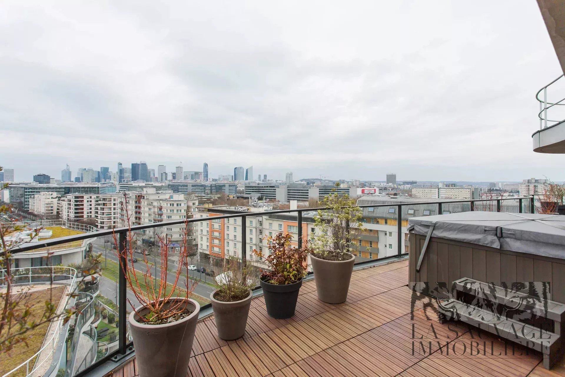 Located on the 10th and top floor of a recent building constructed at the end of 2019, this 107m² loi carrez flat has a large terrace offering a panoramic view of all the monuments of Paris, from La Défense to the Eiffel Tower.
