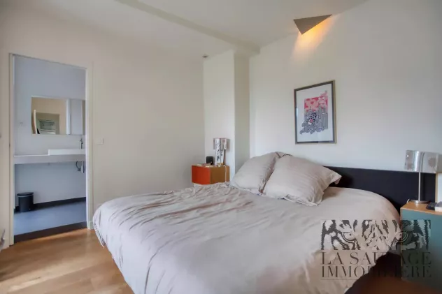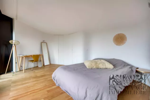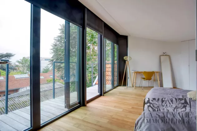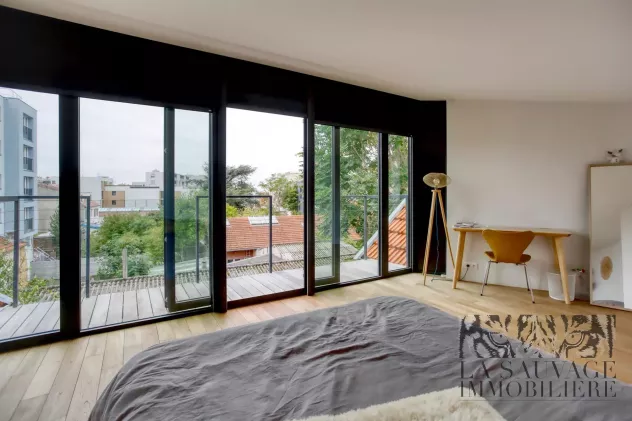 Au deuxième étage, une grande chambre avec dressing et terrasse offre de multiples usages : chambre, salle de sport, atelier ou bureau.