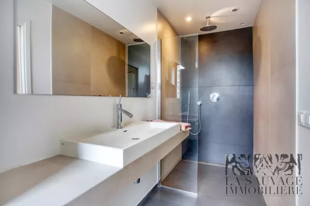Le premier étage abrite une suite parentale élégante avec salle de douche à l’italienne, double dressing et terrasse, ainsi qu’une seconde chambre avec mezzanine idéale pour un espace enfant.