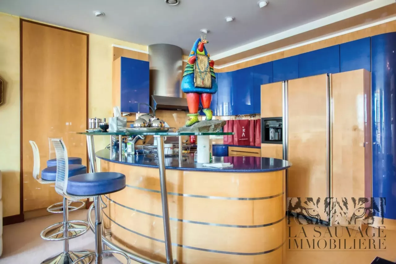 La cuisine américaine, parfaitement intégrée, s’ouvre harmonieusement sur la réception, soulignant la générosité des volumes.