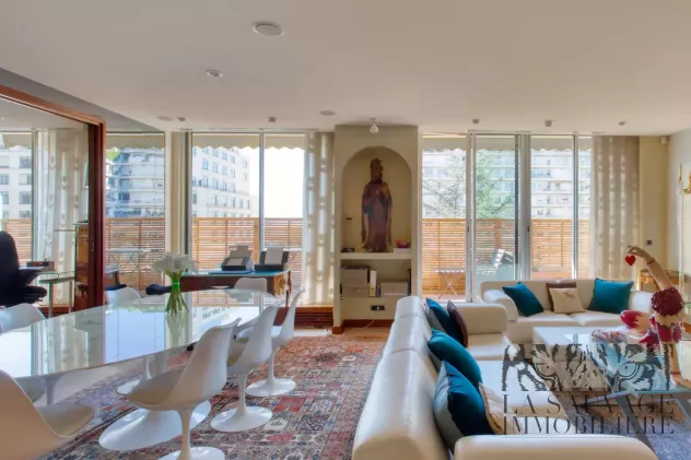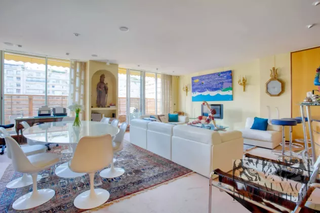 Idéalement situé au cœur du très prisé 16ᵉ arrondissement, à proximité immédiate du Bois de Boulogne, cet appartement traversant de 125,73 m² (loi Carrez) se situe au cinquième étage d’un immeuble de standing.
