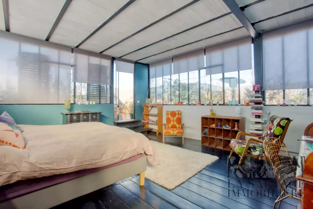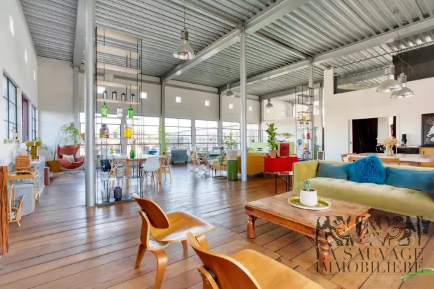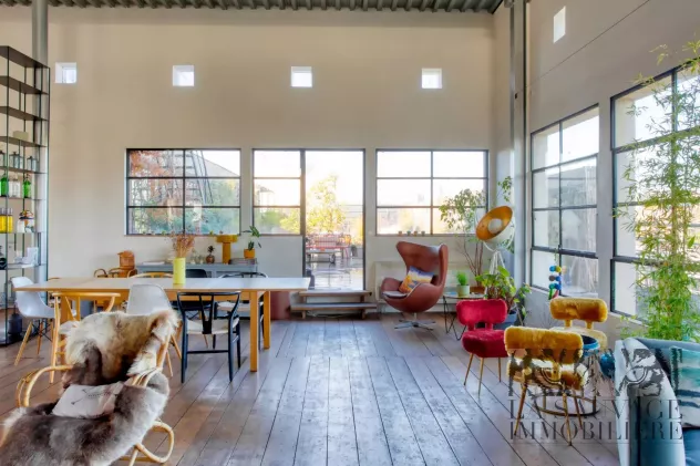 Entièrement ceinturé de verrières de style Bauhaus, il bénéficie d’une luminosité omniprésente et d’une exposition à 360°, sublimée par une hauteur sous plafond avoisinant les 5 mètres.